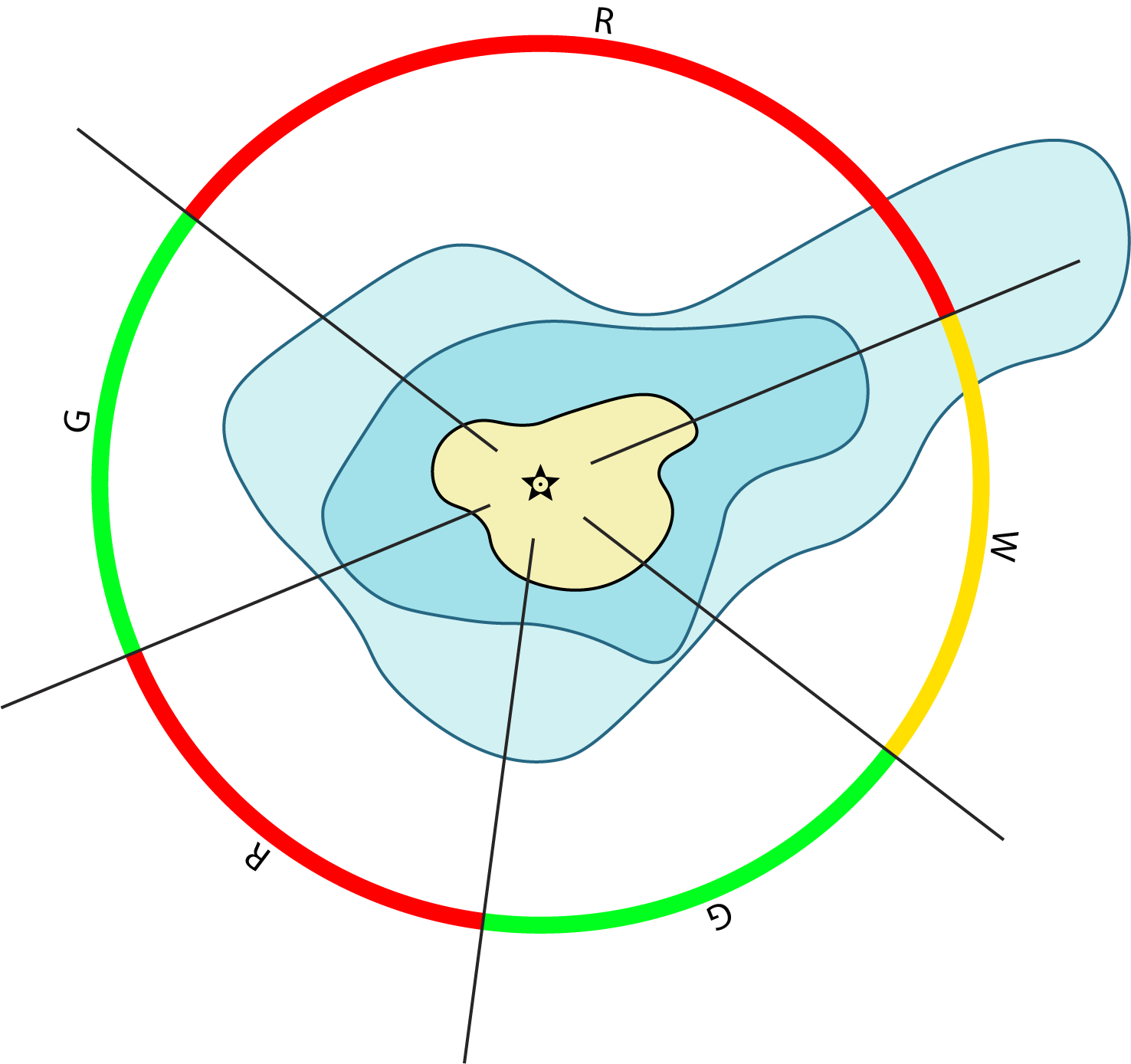 Some of the characteristics have sectors. All of them follow the same pattern and would look like this in a nautical chart:
